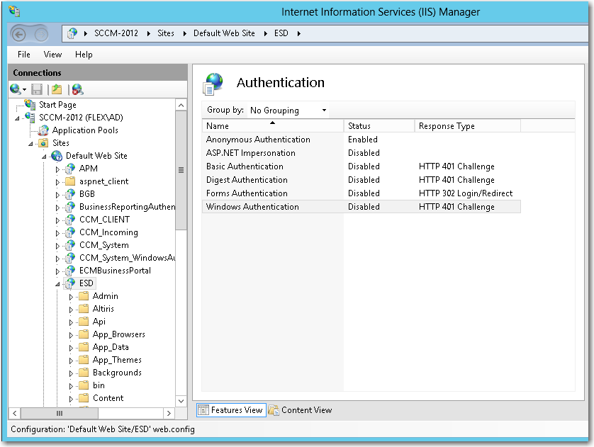 5. To configure IIS to use anonymous authentication instead of Windows authentication, perform the following steps.