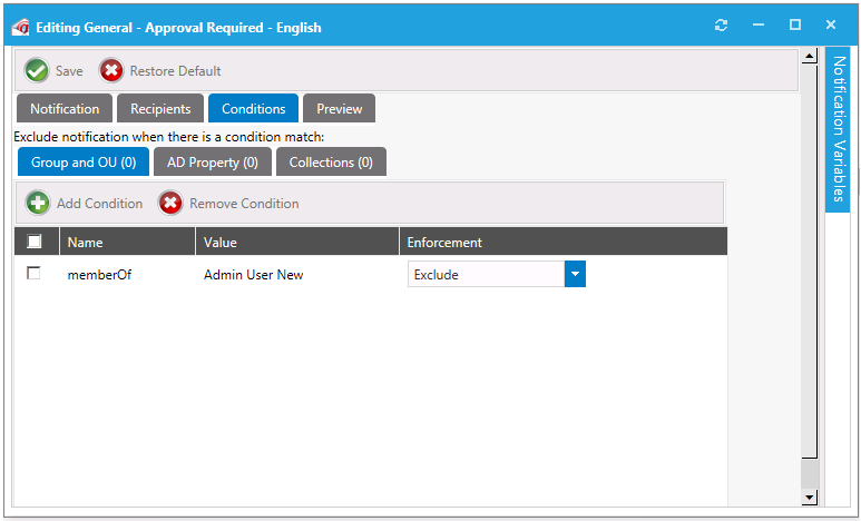 - You can specify conditions on a notification on the Conditions tab.