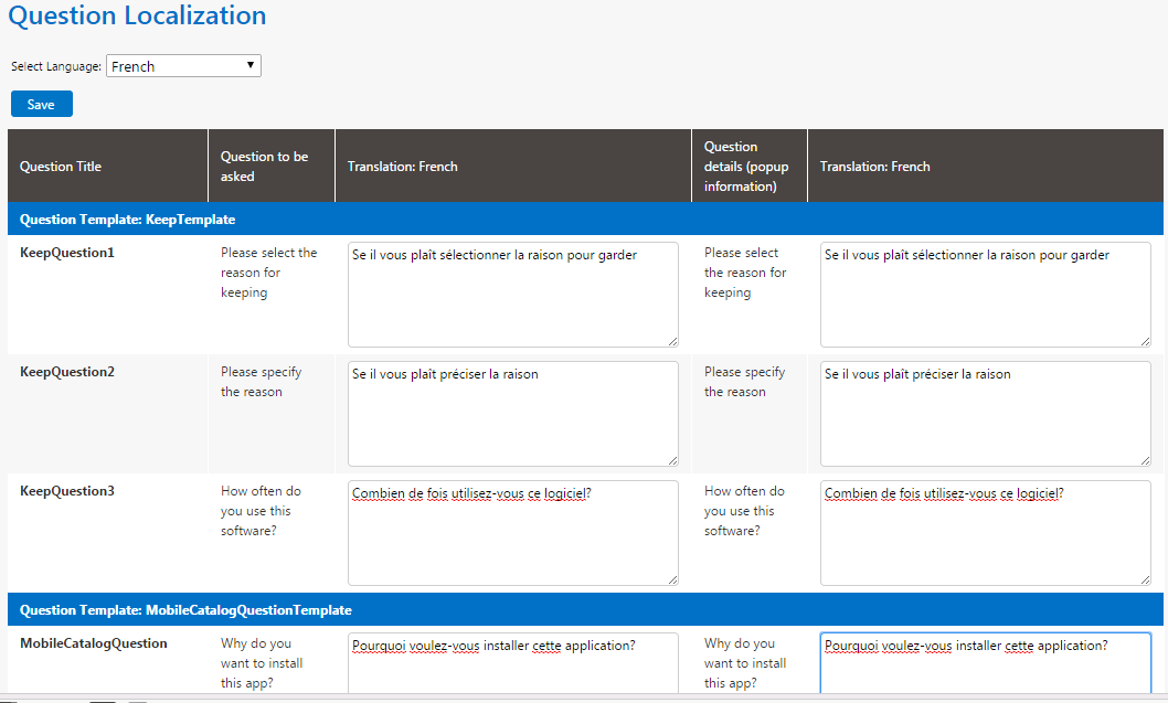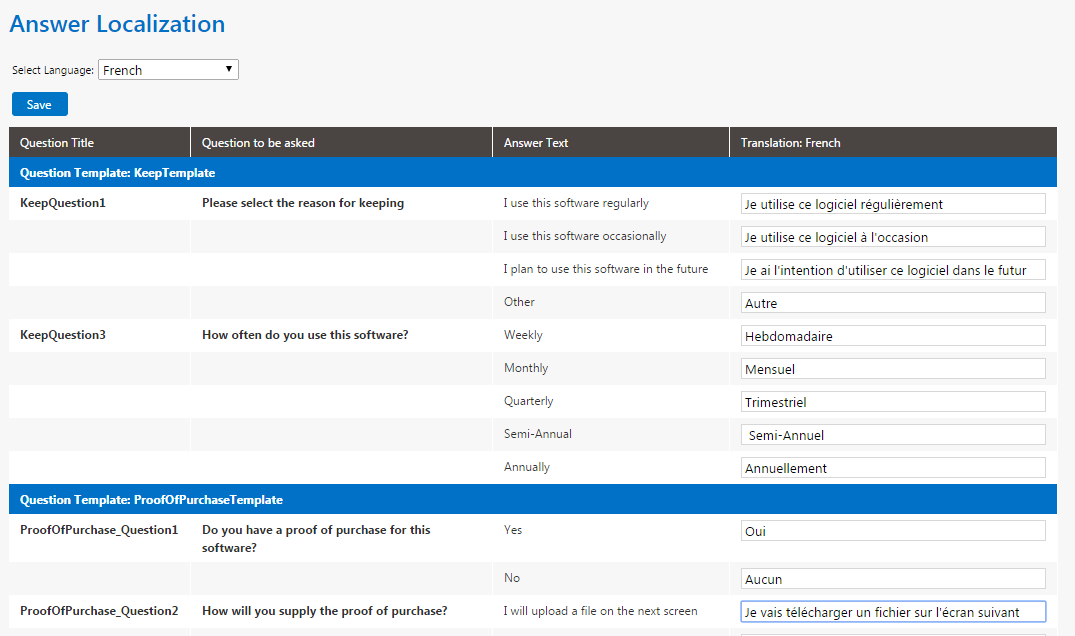 6. From the Select Language list, select the activated language that you want to translate the answers for. The existing answers for each question are listed.