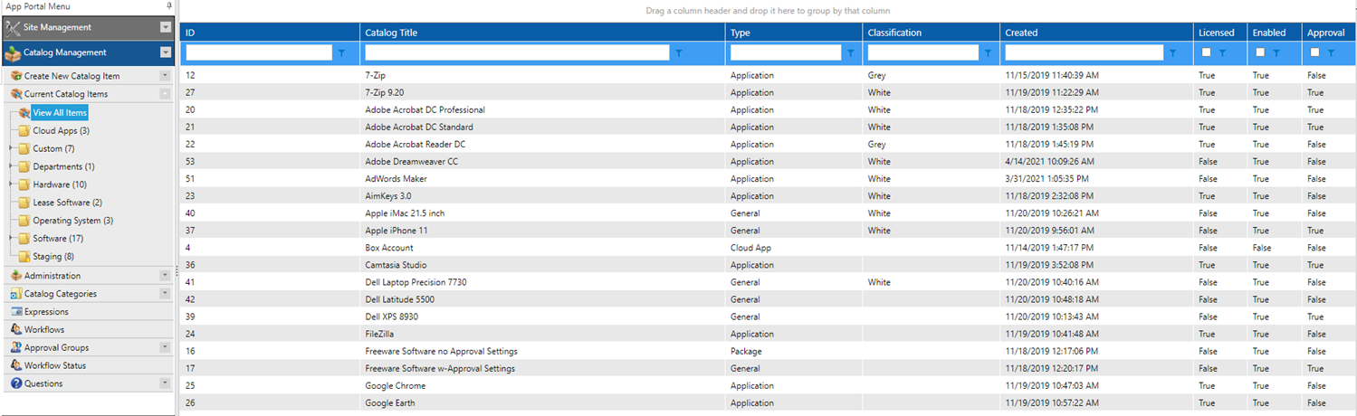 | Approval | Indicates whether an approval is required for this catalog item. Approval is required if the Require Approval for Install?option is selected on theGeneral > Globaltab of theCatalog Item Properties dialog box. |