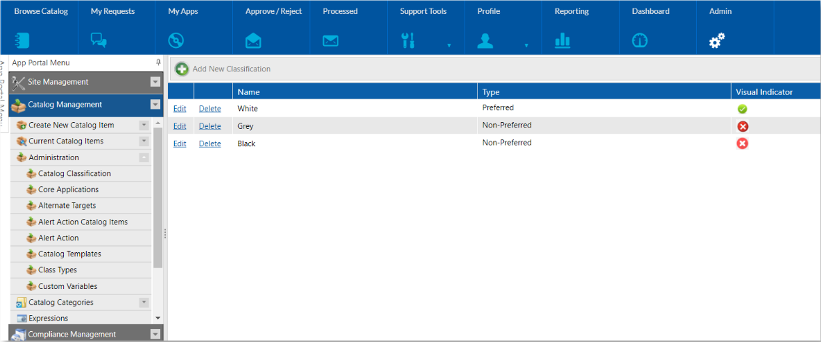 Catalog items can be classified as Preferred or Non-Preferred using Catalog Classification. Classification, which are displayed for each catalog in the Browse Catalog tab, are visible to end users when they are submitting an App Portal request. This helps the end user decide which catalog to create a request.