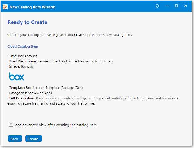 - If, after this catalog item is created, you want to immediately open this catalog item’s Catalog Item Properties dialog box, where you can specify advanced settings, select the Load advanced view after creating the catalog item option.