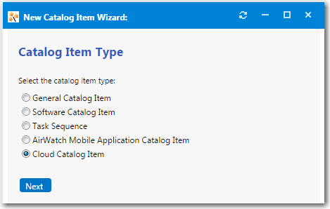 - Under Catalog Management , select New Catalog Item Wizard . The Catalog Item Type panel of the New Catalog Item Wizard opens.