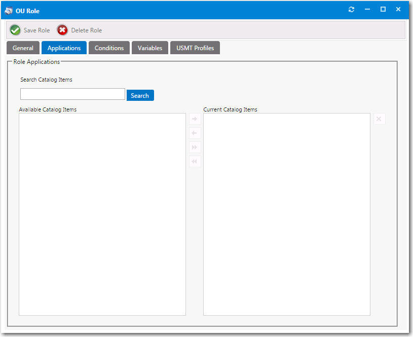 7. Use the Search Catalog Items box to locate catalog items to add to the role. Select a catalog item and then click the right arrow button to move it from the Available Catalog Items list to the Current Catalog Items list, adding the catalog item to the role.