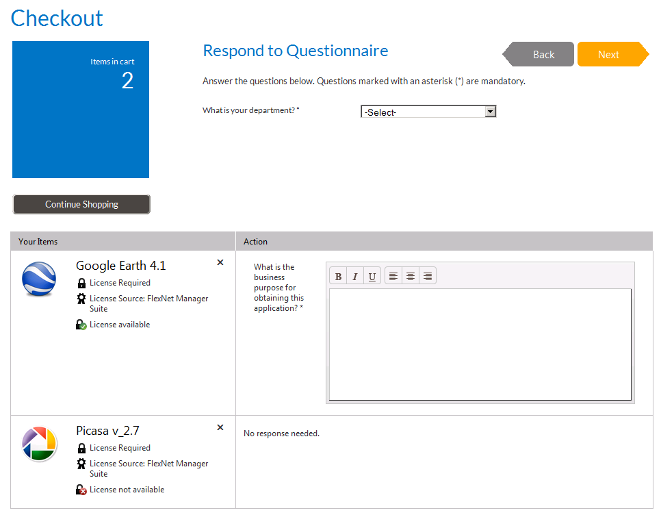 13. Specify the target location for these catalog items, and then click Next . The Respond to Questionnaire pane l opens.